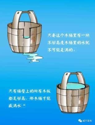 由此可以得出两个推论:其一,只有桶壁上的所有木板都足够高,木桶才能盛满水。其二,只要这个木桶有一块木板不够高度,木桶里的水就不可能是满的。