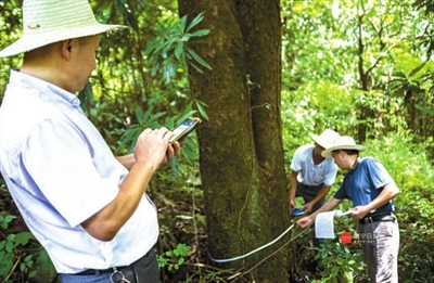 11日,通山县林业局工作人员对国有石航山林场的古树群进行实地核实和确认。据了解,该局为了准确掌握古树名木资源现状,使用GPS对古树名木进行精确定位,统一编号,进行公告,确定其法律地位,建立和完善古树名木大数据信息系统。通讯员 徐辉摄