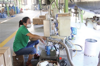8月27日,湖北大海化工实业有限公司生产车间,工人正在进行汽车漆的装罐和封装。