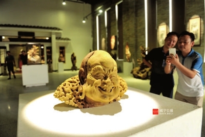 9月1日,赤壁官塘驿镇幸福堰村,“半亩塘文化艺术有限公司”艺术馆,一尊惟妙惟肖富有喜感的木雕佛像吸引了看客驻足拍摄。该馆由私人老板胡志才创建,馆藏融根雕、油画、民俗器具、废铁艺术以及奇石为一体,倡导一种崇尚原生态又不失品质的生活理念。