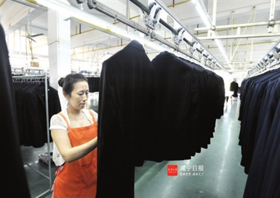 昨日,赤壁市高新区赤马港园区,丽裳制衣有限公司成品车间,工人们正在整理西服。据了解,该公司总投资5000万元,引进7条高档服装生产线,与多家国际知名品牌西装长期合作,产品畅销国内外市场,年产值过亿元。