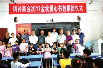 本报讯 特约记者黎志远、通讯员刘天平报道:9月4日,由铜钟乡商会与铜钟乡人民政府共同举办的“爱心书包”捐赠仪式在铜钟乡独石小学举行,铜钟乡商会、铜钟乡党委政府、受赠师生代表共70人参加活动。