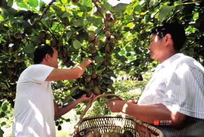 8月28日,赤壁市神山镇文清村金果源现代农业有限公司基地,工人们正在采摘猕猴桃。据了解,该基地种有蓝莓、杨梅、葡萄、火龙果、猕猴桃等十几种精品水果,占地1000亩,目前猕猴桃已成熟开园采摘。 记者 夏正锋 通讯员 崔莉 陈婧 摄