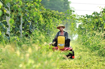 4日,赤壁市中伙铺镇罗县村水果采摘品尝园,果农正驾驶小型割草机除草。