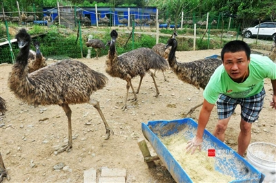 8日,通山县厦铺镇双河村太阳谷鸸鹋生态养殖基地内,负责人徐生作正在给鸸鹋喂食。