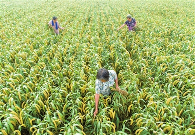9月17日,河北省武邑县孙屯村村民在田地里进行谷子排杂。
