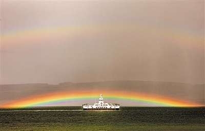 近日,英国苏格兰的野生动物观察者罗杰在马尔岛的菲什尼什角拍摄水獭,他不顾数日倾盆大雨,耐心等待,结果虽没等来水獭,却捕捉到了千载难逢的美景。罗杰拍摄的图片中双彩虹从水面升起,像桥梁般低低垂挂在天边,渡轮正缓缓穿过。 (本报综合)