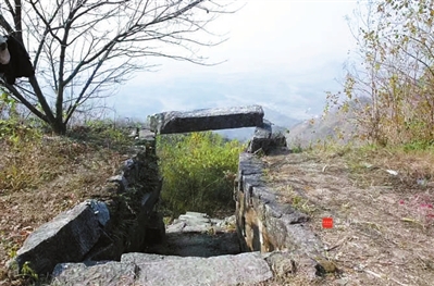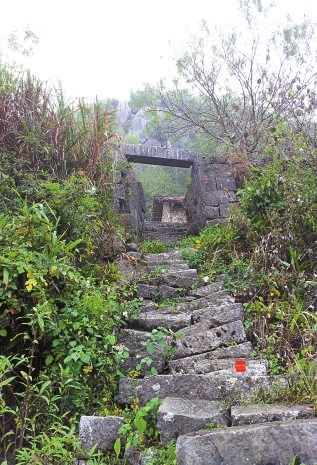 行至半山腰,有一条青石板铺成的上山路。拾级而上,直至海拔大概500多米时,一道石门陡立在前,俨然有如神圣不可侵犯,不禁令人肃然起敬。