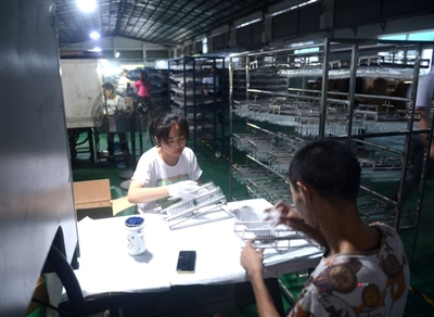 18日,湖北(通山)创盛光学有限公司员工在检验高端眼镜片。