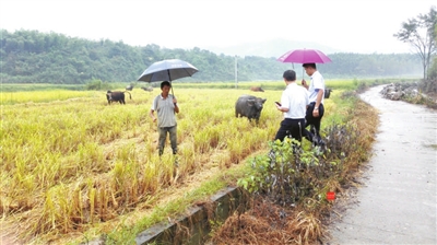 王炎生带我们去看他放养的牛。隔着几亩稻田,远远就能看到几头牛。我们担心路太远,老人行走不便。没想到,老人拿着棍子在前面探路,走得又快又稳。而且,他还专在路边走,不走路中间,一点也不怕跌到田里。“他越在路边走,就越知道路,哪里拐弯抹角都清楚。”随行的赤壁农商行茶庵支行行长宋伟星说,他们经常来了解老人的养牛情况,申报贴息材料,很熟悉王炎生的走路习性。
