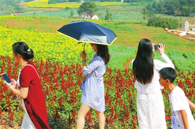 下图为咸安区向阳湖湿地花海,国庆期间鲜花怒放,游客在公园内赏花、观景、拍照。 (相关报道见第二版)
