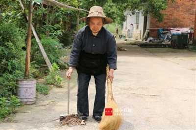记者见到唐安心老人时,她正在“刷、刷、刷……”,扫着村前的堂屋,不一会儿,目及之处都变得干干净净,清清爽爽。
