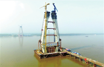 9日,嘉鱼长江公路大桥南主塔,工人们正在主塔上浇筑索塔。