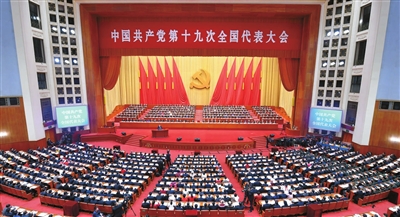 人民大会堂雄伟庄严,万人大礼堂气氛热烈。主席台上方悬挂着“中国共产党第十九次全国代表大会”的会标,后幕正中是镰刀和锤头组成的党徽,10面鲜艳的红旗分列两侧。二楼和三楼眺台上分别悬挂着“不忘初心,牢记使命,高举中国特色社会主义伟大旗帜,决胜全面建成小康社会,夺取新时代中国特色社会主义伟大胜利,为实现中华民族伟大复兴的中国梦不懈奋斗!”“伟大、光荣、正确的中国共产党万岁!”的横幅。