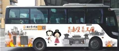 外车身喷涂了赤壁三国元素:赤壁宝宝(周瑜、小乔卡通造型)、赤壁之战场景、景区宣传口号、景区名称及二维码,一目了然,区别于其他旅游车辆。
