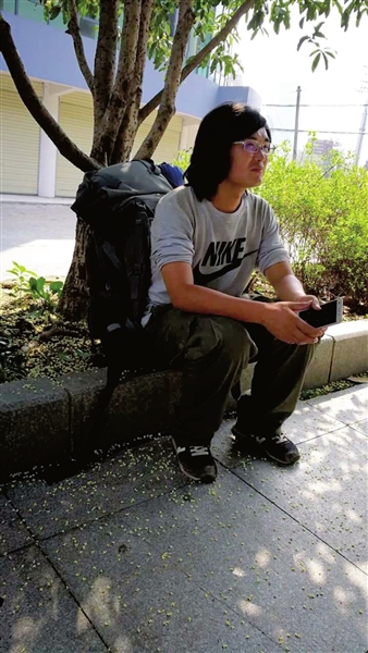 一号桥头,眉目清秀,长发齐肩,笑容灿烂,背着硕大的牛仔包的郭利龙挥手跟记者打招呼,乍一看记者还以为是个女生。