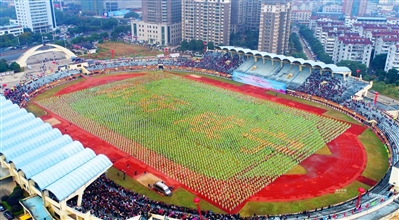在现场,历经两个多月排练的1万余名市民,一同穿着“你好,咸宁”文化衫,拼出“你好,咸宁”,凸显了“健康咸宁,魅力香城”的运动理念和中部绿心色彩。经世界纪录认证机构WRCA官方人员现场确认,参加人数达到世界纪录要求,认定为是“最大规模的广场舞中文人体拼字”世界纪录。