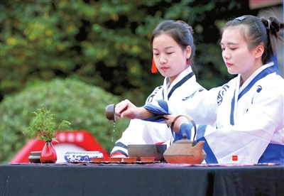 活动现场,身着红色古典汉服的茶艺表演者钱君华登上舞台,在优美的音乐声中,娴熟地表演起了茶艺。