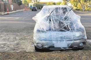 澳大利亚墨尔本一名市民因将私家车违规停在郊外的施工工地,结果受到了被保鲜膜包裹车身的另类惩罚。恶搞者连夜用保鲜膜将这辆四驱车整个车身层层包裹,连倒车镜也未放过。除了前挡风玻璃雨刷器被故意露在外面,整辆车已被“全副武装”,面目全非。奇怪的是,这辆汽车并不是违停在这一区域的唯一车辆,不远处的一辆小型黑色掀背式汽车却能幸免。