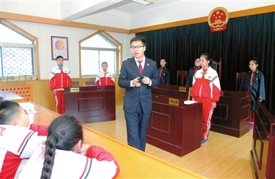 12月4日,在石家庄市建胜路小学,校园模拟法庭正在开庭,石家庄市桥西区检察院青年检察官谢飞现场为学生们讲解庭审程序。