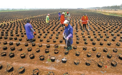 11日,嘉鱼县新街镇王家月村1组花卉种植基地,村民们正在给新培育的火焰石楠浇水。