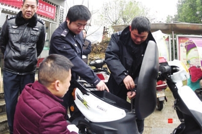 12月14日,咸安警方工作人员正在咸安区长安社区为居民电瓶车安装智能防盗芯片。为降低摩托车、电瓶车被盗案件发案率,提高破案追赃力度,咸安警方于今年11月启动“两车”物联网感知防控系统建设,用于解决防盗追踪、车辆管理和保险理赔等难题,并向社会群众免费安装1万辆。 通讯员 吴涛 刘洁 戴娟 摄