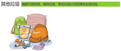 4.其他垃圾:废弃的卫生巾、纸尿裤、餐巾纸、卫生纸、面巾纸、湿巾纸、烟蒂、陶瓷制品、玻璃纤维制品(如安全帽)、海棉、旅行袋、球类、花盆、地毯、踏垫、浴巾、毛巾、帽子、棉被、枕头、床单、床罩、面料(含碎布)、衣服、鞋类、袜子、窗帘、桌布、围裙等。