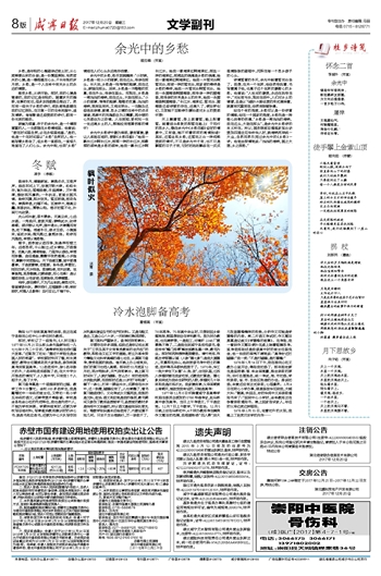 诗情雪意的冬天,余光中踩着雪花白走了。我想,在另一个世界,他依然寻找着、书写着属于他,也属于这个世界的最慰心的乡愁。他曾说:“人世间的最美,永远在找寻当中。”无论苦与乐,现实生活中,人们对乡土的情愫,总是以飞蛾扑火般优美的形式演绎着,就算有沉重苦涩,依然有甜蜜弥漫。