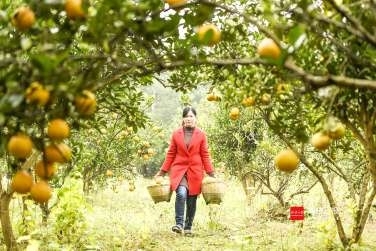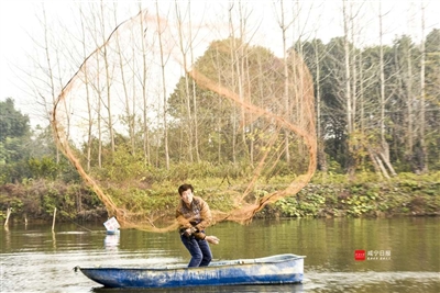 该公司董事长张红平正在撒鱼网,他的妻子杨小红忙着在采橙。