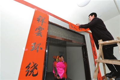 1月4日,在湖北省保康县马桥镇白竹头村易地扶贫搬迁集中安置小区,村民王延波(右)在新房门前贴对联。