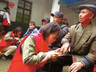 同时,大家细心地为每一位老人修剪指甲,分发礼物,队员们还一起为老人表演节目。