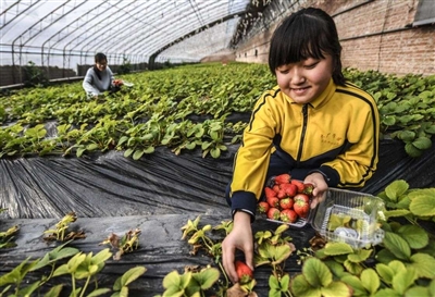 1月15日,游客在河北省大厂回族自治县沁心农业园采摘草莓。