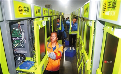 9日,湖北智莱科技有限公司员工在检验电子存包柜架质量。