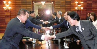 1月15日,在板门店朝方一侧的统一阁,朝韩双方代表握手。朝韩双方代表在板门店朝方一侧的统一阁会晤,双方就平昌冬奥会和冬残奥会之际朝方派艺术团赴韩演出一事达成一致。 据新华社