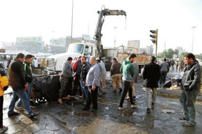 1月15日,在伊拉克首都巴格达,人们聚集在爆炸现场附近。伊拉克安全部门15日说,首都巴格达当天上午发生两起炸弹袭击事件,已造成16人丧生、67人受伤。 据新华社