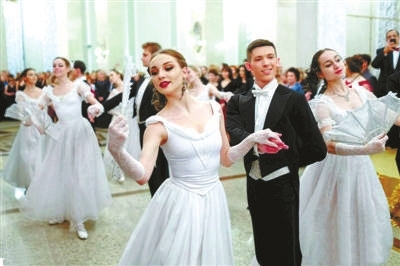 当地时间1月13日,白俄罗斯明斯克剧院举行新年舞会,俊男靓女翩翩起舞欢庆2018年的到来。