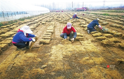15日,赤壁市官塘驿镇鑫鑫草场内,当地农民在整理草坪准备销售外地。近年来,该镇利用当地资源优势,引导农民大力发展猕猴桃、楠竹、草坪等特色种植业,助农增收致富。