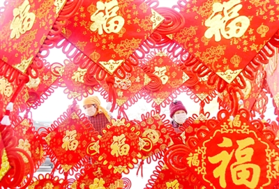 1月19日,山东省沂源县历山街道的工人在加工节庆饰品。