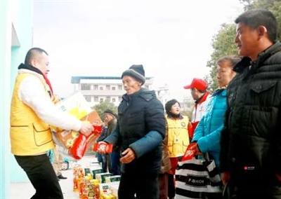 1月13日,通城县马港镇政府院内,广东狮子会晴天服务队携手通城爱心会为该镇29户贫困村民派发3万元红包和油米等过年物资。 通讯员 阿玮 摄