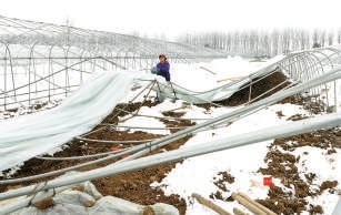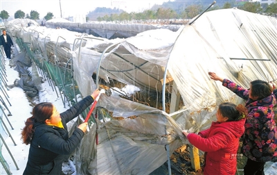上图:28日,嘉鱼新街镇马鞍山村,菜农张桂兰正在清理被大雪压垮的育苗大棚。