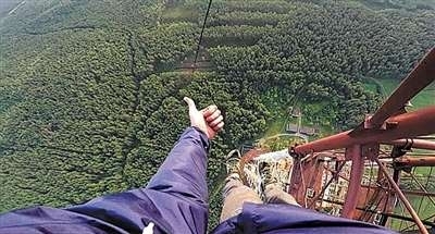日前,俄罗斯19岁男子亚历克斯在没有安全防护设备的情况下,独自登上了莫斯科一座高1200英尺(约370米)的工作塔,并在塔顶表演了单手抓栏悬空身体的惊险动作。他全程佩戴头顶摄像机,视频被上传至网络后引发关注。这一惊险过程让人不禁为他捏把汗,但是他本人是很享受的样子,不仅伸出大拇指庆祝胜利,还将双腿做跑步状来回摆动。