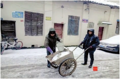 “工作人员都来帮我们铲雪了,家里有人手的都来加入吧!”43岁的西大街居民汪博高兴地号召着邻里街坊。大家纷纷积极响应,加入到了扫雪的行列里。不时刮起刺骨的寒风把大家的脸冻红了、手冻僵了。但大家的心里却是暖融融的。