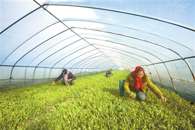 2月4日,江苏省南通市海安县曲塘镇一农场的工作人员在大棚中采摘豌豆苗。