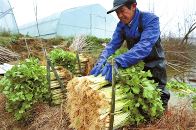 2日,赤壁市强光种植专业合作社蔬菜基地,温室大棚内白芹长势喜人,棚外已采摘的白芹等待出售。种植户陈七军介绍,目前白芹市场看好。