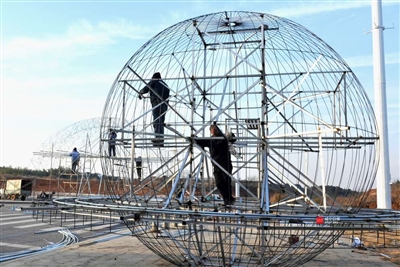 6日,在武咸城铁贺胜东站一带,工人们在加紧制作以航天科技、吉祥物、星月等为主题的大型彩灯组,为即将到来的农历新年大型彩灯展做准备。