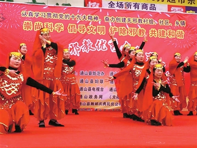 2月2日,湖北省九宫山国家级自然保护区管理局船埠村文化艺术团一行30余人,带着反邪教小品参加全县反对邪教文艺汇演并获得一等奖。 通讯员 李志华 摄