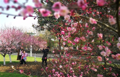 农历正月初二,阳光普照,市人民广场梅花悄然绽放,许多市民游客前来观赏。