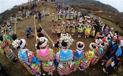2月22日,贵州省黔南布依族苗族自治州龙里县龙山镇水苔村的苗族同胞身着节日盛装参加“跳月”活动。“跳月”是苗族同胞祭祀、欢庆新春的传统民俗活动,更是苗族青年男女寻找意中人的大型社交活动。据新华社