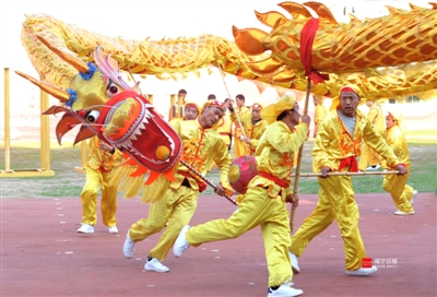 其中举龙头的表演者梁帅特别引人注目。他手法娴熟,身形灵活,龙头在他的手里,时而腾起,时而俯冲,引得龙身左耸右伏,蜿蜒翻腾,十分生动。
