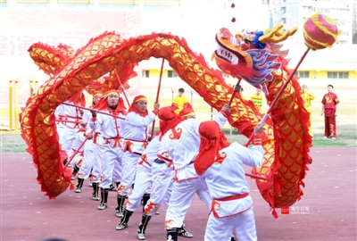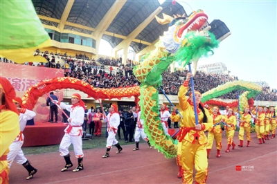 “咚、咚、咚……”在喜庆的锣鼓声中,一条条祥龙翻腾而出,引得观众席上的市民阵阵高呼。